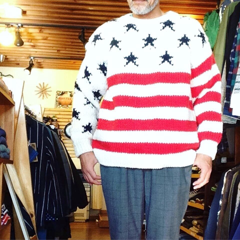 一般的にはナチュラルな印象のざっくりニットですが、そこはサニーらしく、かなりインパクトのある星条旗柄。